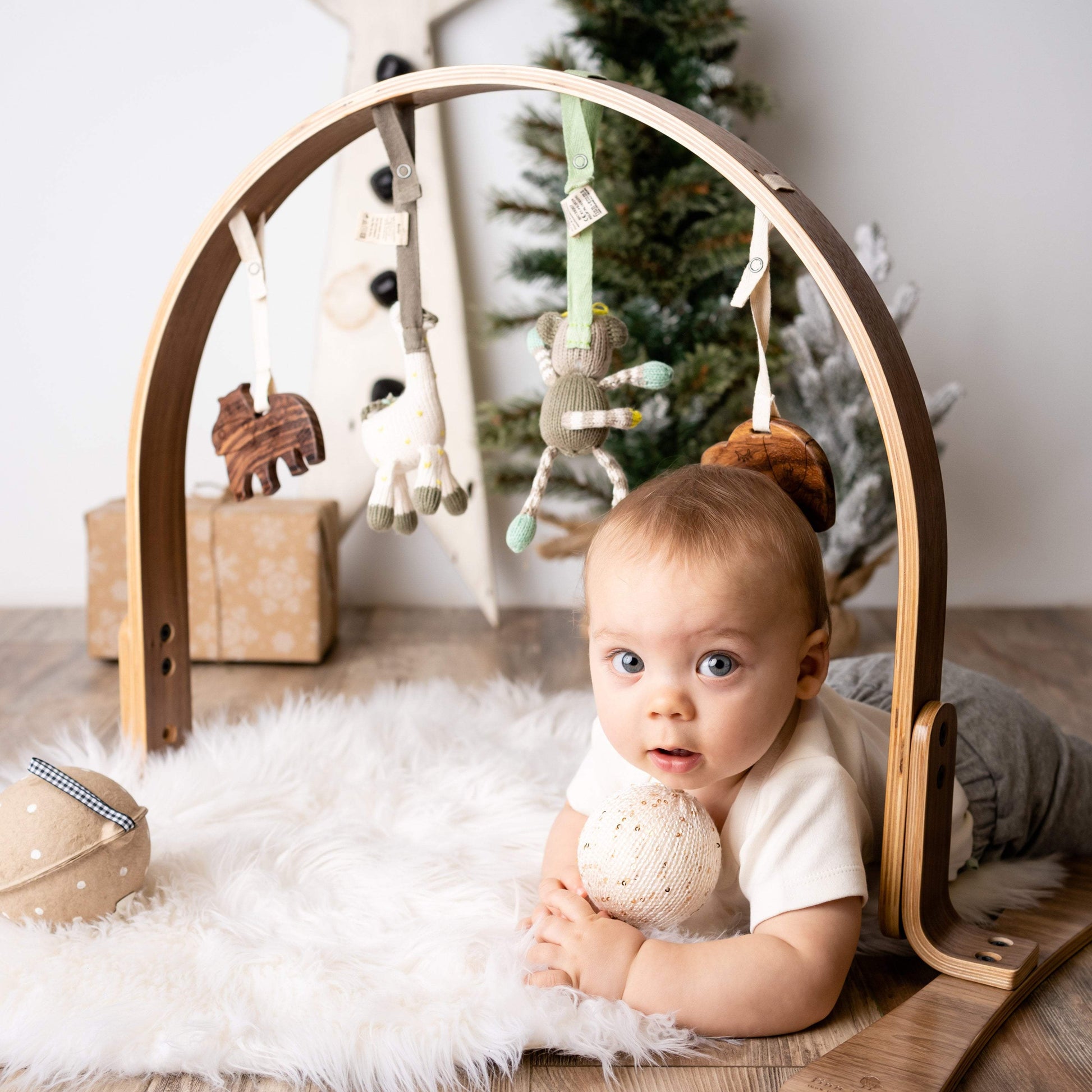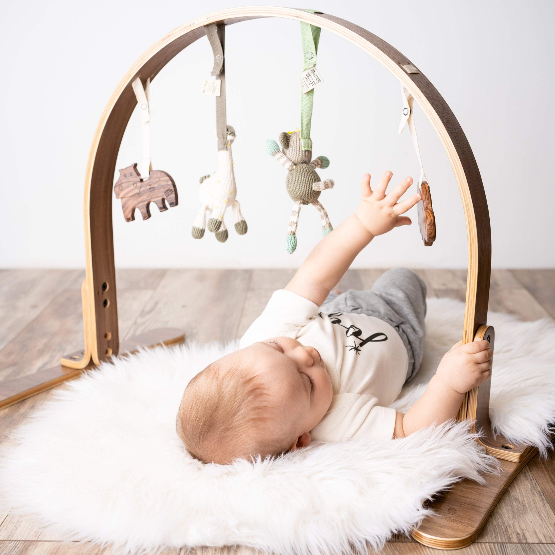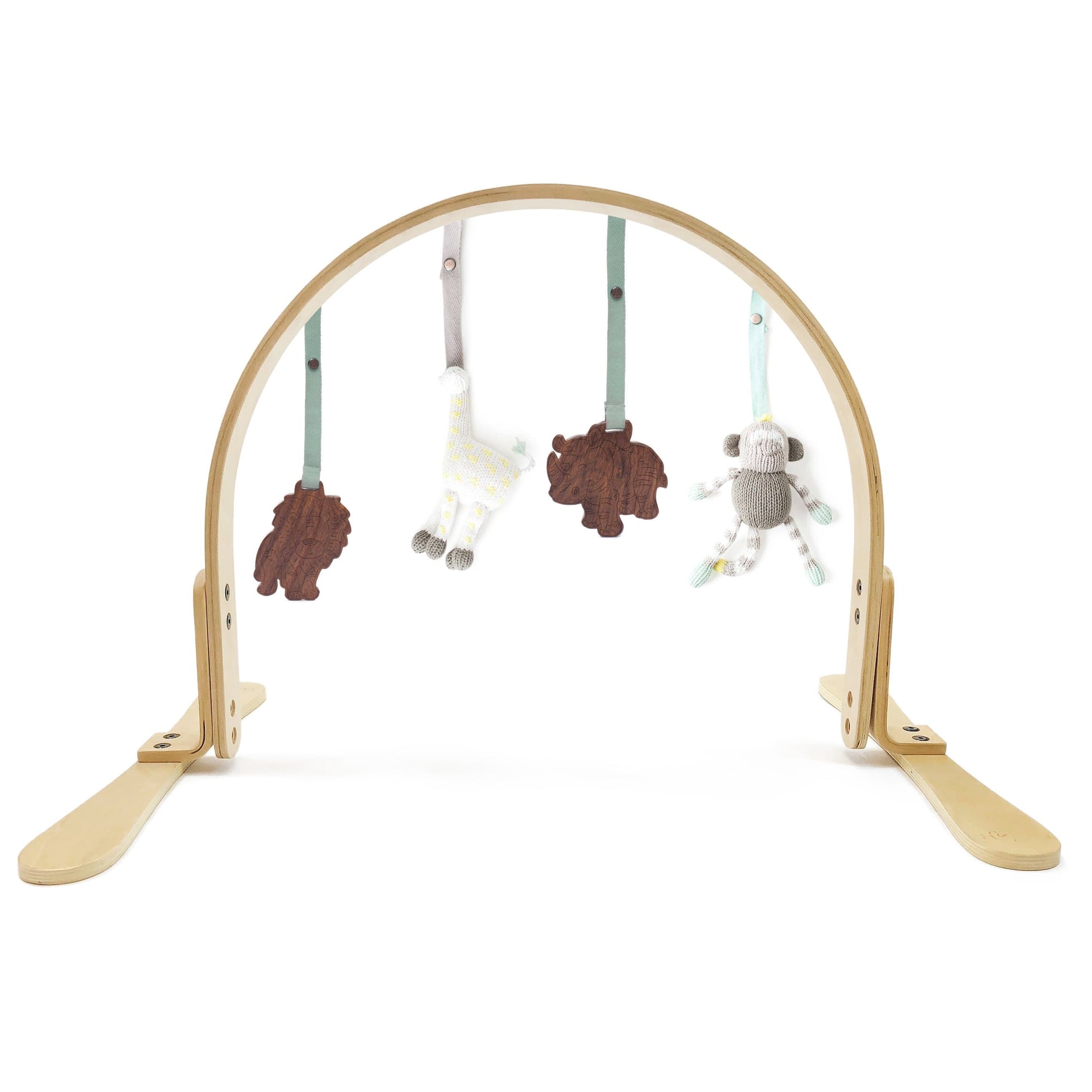 Get ready for the best play date ever! Our height-adjustable play gym has a 100% birch wood frame finished with non-toxic stains and lacquers. The wooden teething toys are made from untreated Indian hardwood and finished with vegetable seed wax. The knit toys were hand-knit at an artisanal women's collaborative in Peru using organic cotton yarn. All play gym dolls are removable—they can be used away from the gym as stroller or carseat toys and all of our "Stroller Toys" fit on the gym! Best of all, they'll never need a ride home at the end of the play date.